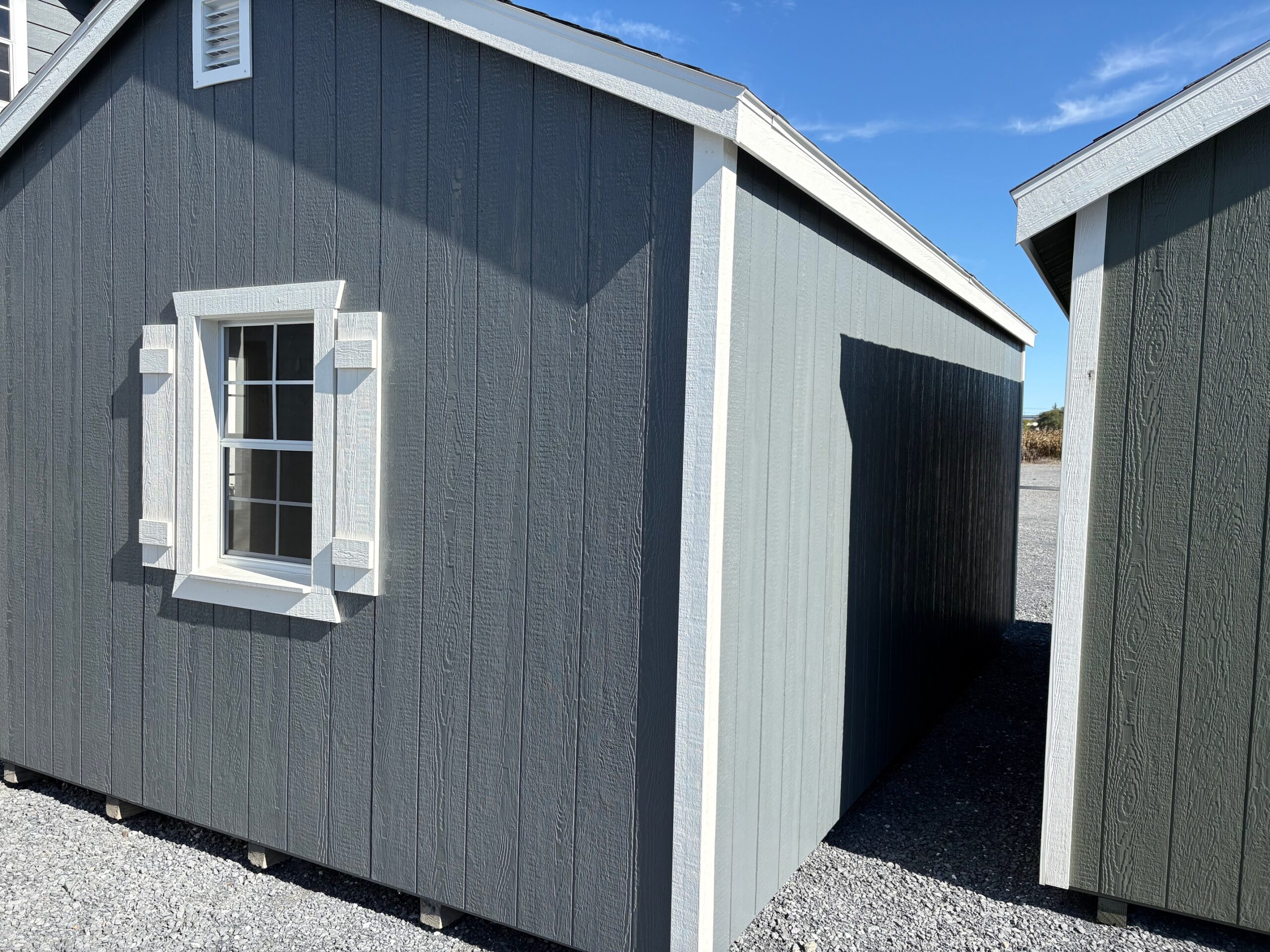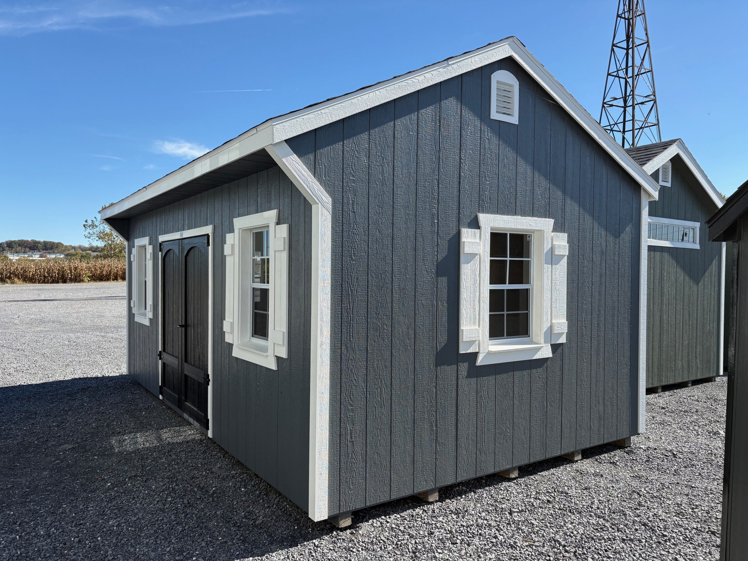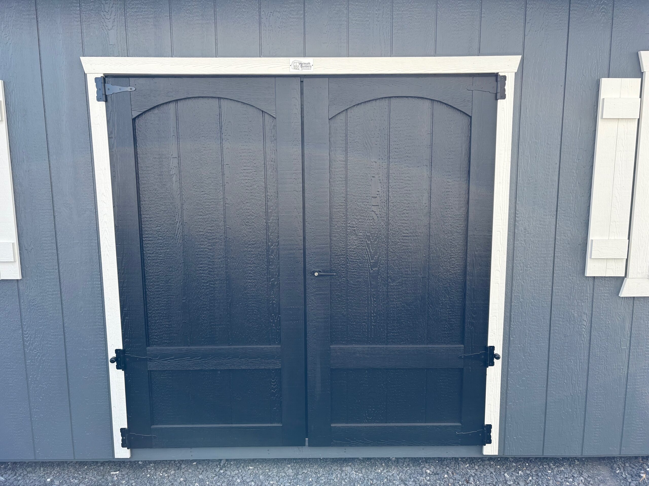 12x20x8 Lakeside; Dark Gray; White Trim; Charcoal Shingles; White Shutters; 6′ Double Door w/ Decorative Arch Trim; 4) 24″x36″ Recessed Windows