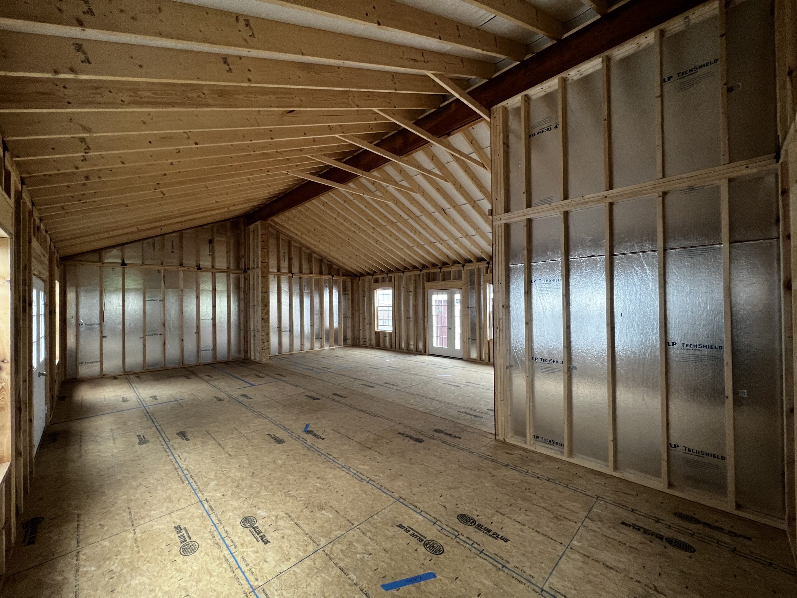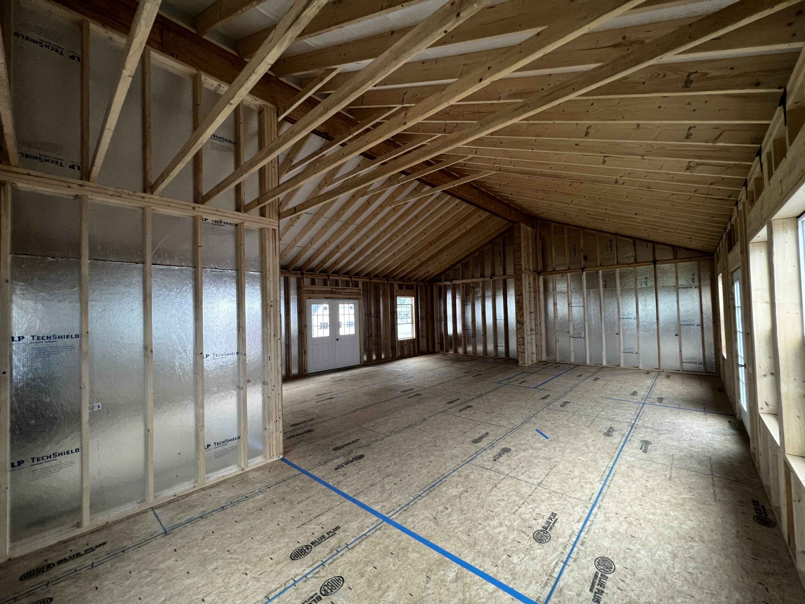 28x36x9 5/12 Pitch Modular – Built to Pass Code!Vinyl Siding, 2×6 Wall Studs, 2×12 Floor Joists 16 O.C., 1 – Prehung 9-Light Double Door, 1 – Prehung 9-Light Single Door, 1 – 54″ Prehung Door w/ Operating Sidelight, 6 – 36×60 Insulated Windows, 2 – 24×36 Insulated Windows, R-14.7 Astro Armor Roof Insulation.